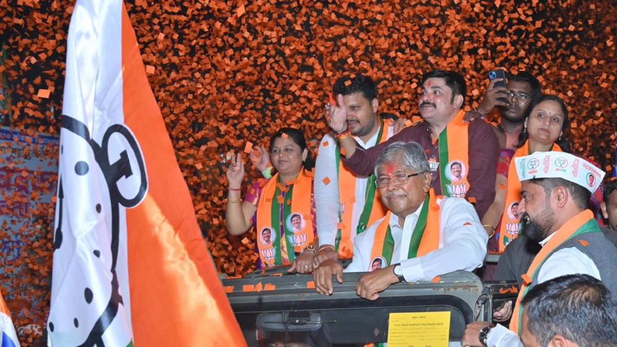 चंद्रकांत पाटलांच्या बाईक रॅलीला मोठी गर्दी; फटाक्यांच्या आतिषबाजी आणि पुष्पवृष्टीने जागोजागी स्वागत