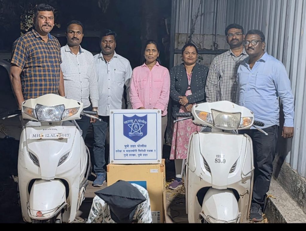 दरोडा व वाहनचोरी विरोधी पथक १ कडील पोलीस अंमलदार फरासखाना पोलीस स्टेशन गु.र.नं.५७/२०२६ भा.न्या.सं.क ३०३ (२) हा गुन्हा दाखल झालेपासून सीसीटीव्ही फुटेज चेक करीत असताना सीसीटीव्ही फुटेज चे आधारे माहीती प्राप्त झाली की, सदर गुन्ह्यातील वाहनचोरी करणारा संशयित इसम हा गोकुळनगर, कात्रज या परीसरात फिरत आहे. सदरची माहीती पोलीस निरीक्षक, दरोडा व वाहनचोरी विरोधी पथक १ वर्षा देशमुख यांना कळविली असता त्यांनी सदर ठिकाणी जावुन खात्री करुन योग्य ती कारवाई करण्याचे आदेश दिल्याने नमुद ठिकाणी स्टाफसह सापळा रचून संशयित इसम यास १७/४५ वाजता त्याचे रहाते घराचे टेरेस वरून ताब्यात घेवुन त्यास त्याचे नाव, पत्ता विचारता त्याने त्याचे नाव राकेश दिपक विश्वकर्मा वय-१९ वर्षे रा. शिवशंभो गल्ली नं.१, गोकुळनगर, कात्रज कोंढवा रोड, कात्रज पुणे असे असल्याचे सांगितले. त्याचेकडे अधिक चौकशी केली असता त्याने फरासखाना पोलीस स्टेशन, गु.र.नं ५६/२०२६, भा.न्या.सं.क ३०३ (२) मधील एक पांढ-या रंगाची अॅक्टीव्हा मोपेड गाडी नंबर MH12KV8169 तसेच खडक पोलीस स्टेशन, गु.र.नं. ४३३/२०२५, भा.न्या.सं.क ३०३ (२) मधील एक पांढऱ्या रंगाची अॅक्टीव्हा मोपेड गाडी नंबर MH42AL3017 या गाड्या चोरी केल्याचे कबुल केल्याने त्यास फरासखाना पोलीस स्टेशन येथे पुढील कारवाईकरीता ताब्यात देण्यात आले आहे.